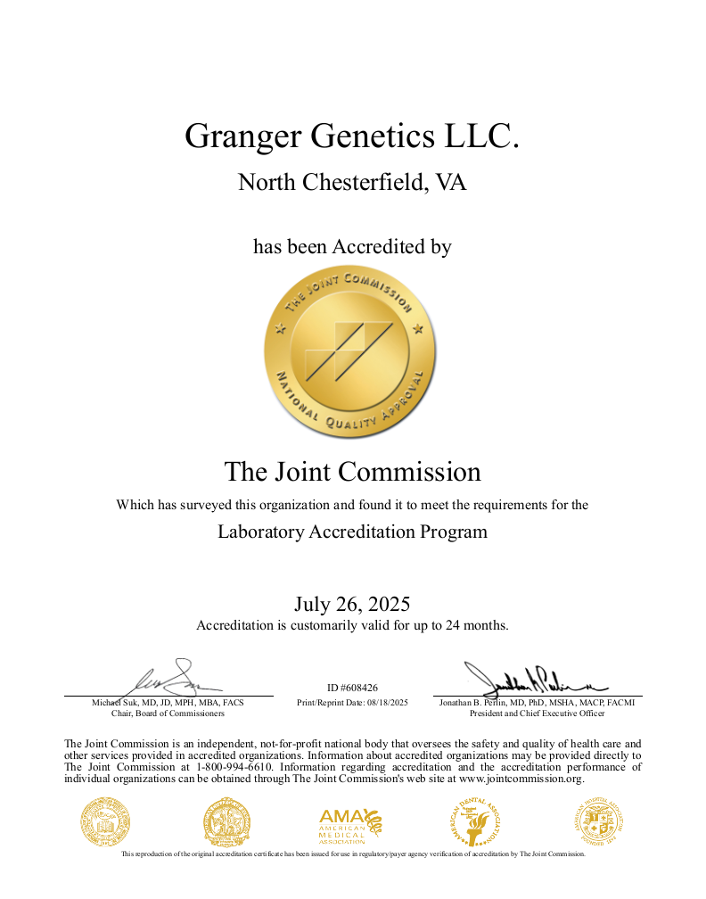 Granger Genetics has earned The Joint Commission’s Gold Seal of Approval® for Laboratory Services Accreditation by demonstrating continuous compliance with its performance standards. The Gold Seal of Approval® is a symbol of quality that reflects an organization’s commitment to providing safe and effective patient care.